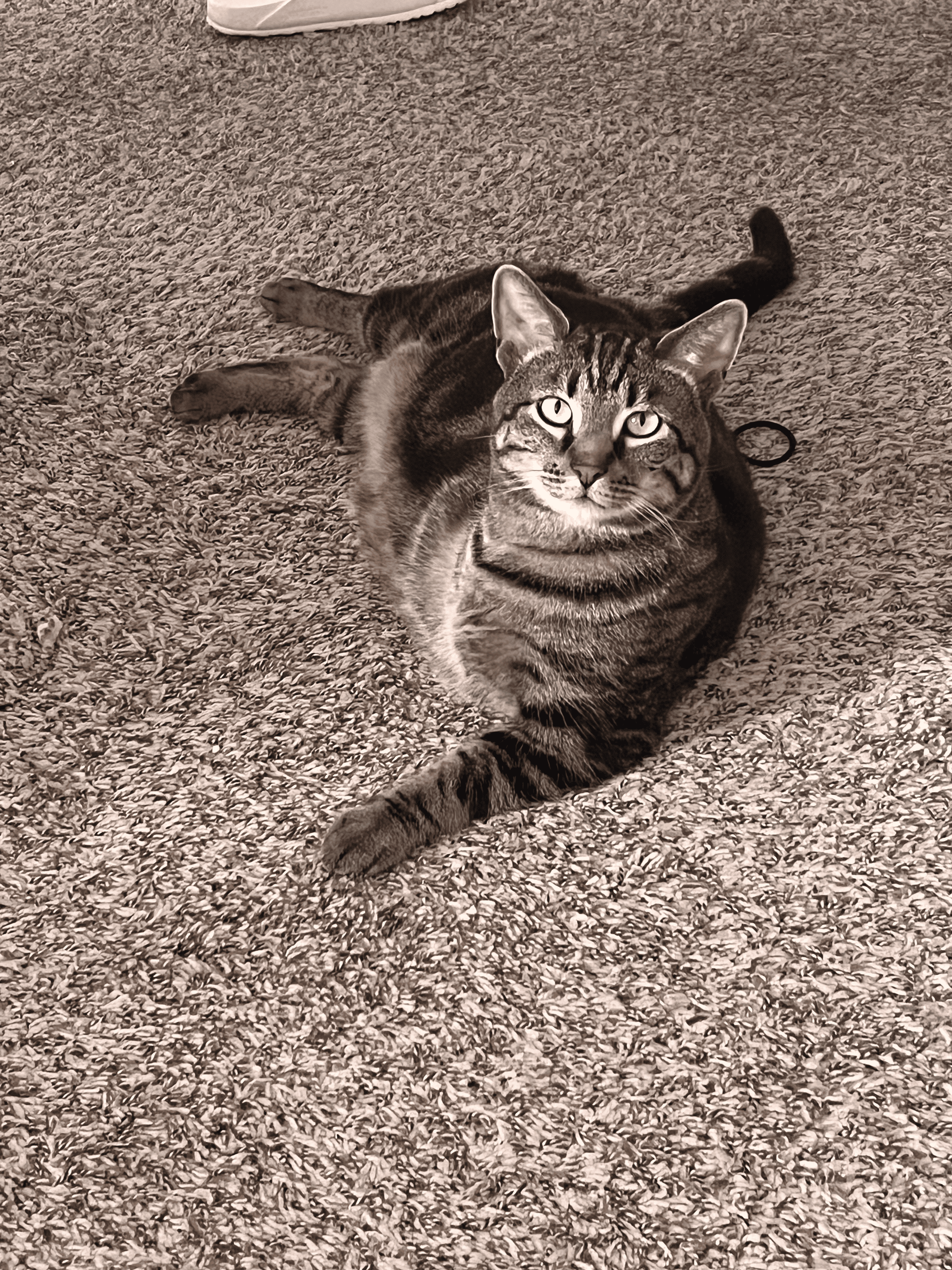 Hey, I’m Bozo - you can call me Bo for short. I’m a black and gray tabby cat, and yes, I only have three legs. I lost my leg after a scary fall back in 2021 - but don’t let it fool you, I am crazier and faster than I was when I had all legs! When I’m not being a chatterbox, I enjoy sitting in the windowsill and watching my bird friends, as well as stealing and playing with my mom's hair ties.