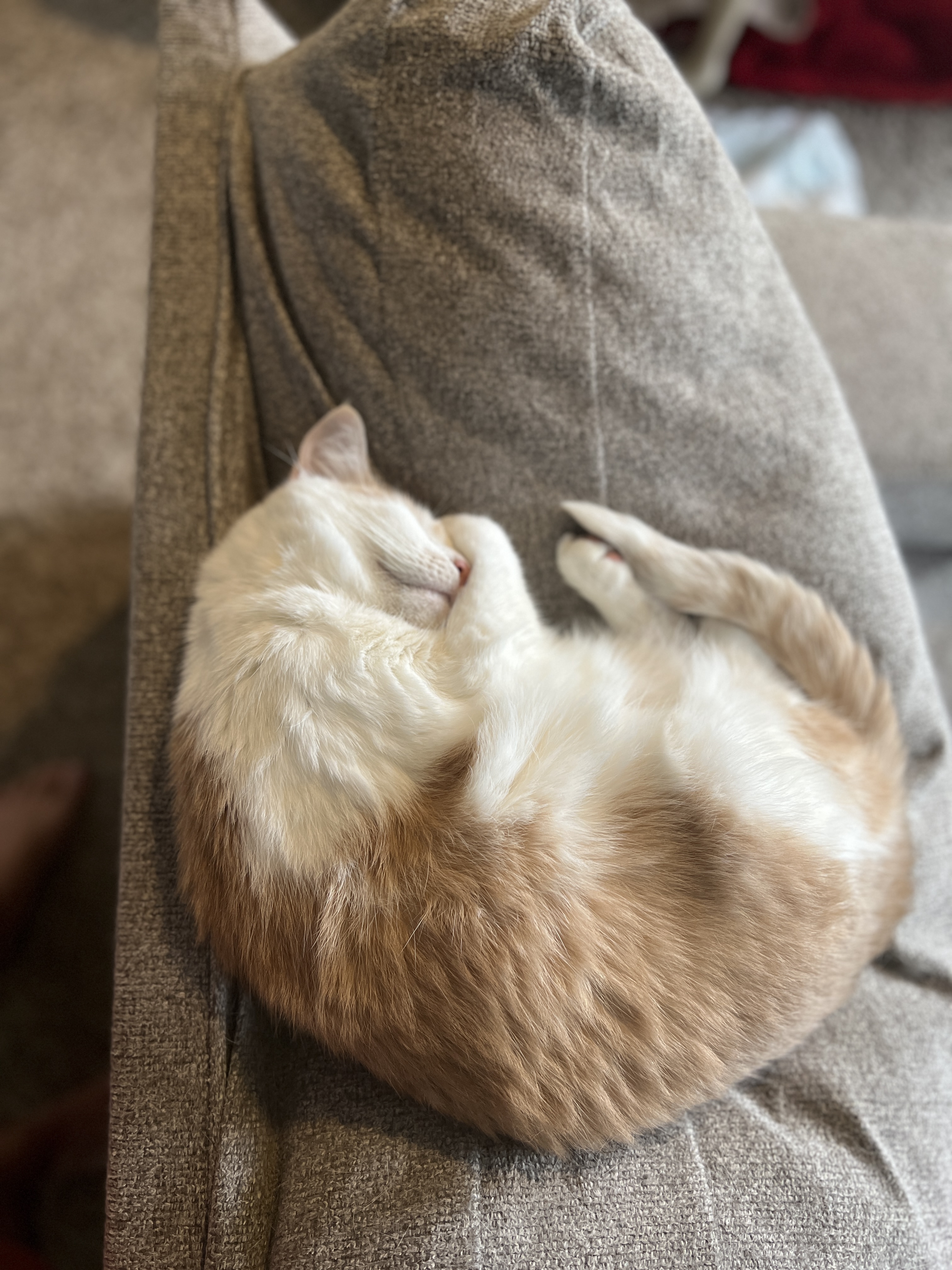 Hi, I’m Milo! I’m an orange and white tabby cat who loves to sleep, sleep, and sleep some more! When I’m not cuddling with my brother or finding a new place to sleep, I’m probably begging for wet food or following around Bo wherever he goes!